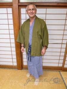 Unser Gastwirt versorgte uns zunächst mit einem selbstgebrühten Kaffee und zeigte uns dann unser Zimmer, das ungewöhnlich groß ist, sicher um die 45 qm. Und er brachte uns japanische Kleidung, die aus vier Teilen besteht: Einem langen Gewand, das man um sich wickelt, einem Gürtel, mit dem man dieses umfasst, einer kurzen Jacke mit weiten Ärmeln und einem Paar Socken, das einen separaten Platz für den großen Zeh vorsieht. -Ach ja, dazu gehören dann aber noch zwei weitere wichtige Utensilien: ein kleiner Henkelbeutel, in den man die Dinge verstaut, die man im Bad dabei haben muss, und natürlich Holzflipflops.