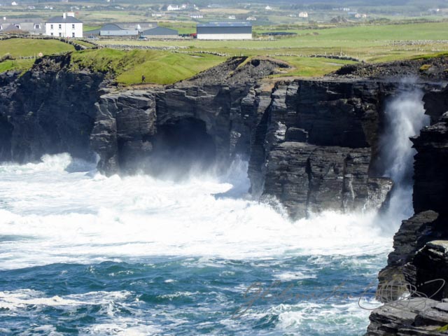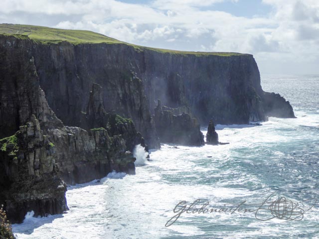 Das Wetter ist natürlich wunderbar – haben wir ja auch mitgebracht – wenn auch ein bisschen windig. Das tiefblaue Meer produziert beeindruckende Wellen, die an die Steilküste donnern. Grüne Wiesen, Schafe und Kühe, Meer und Cliffs – Irland-Klischee pur. Aber so ist es wirklich! Schaut selber: