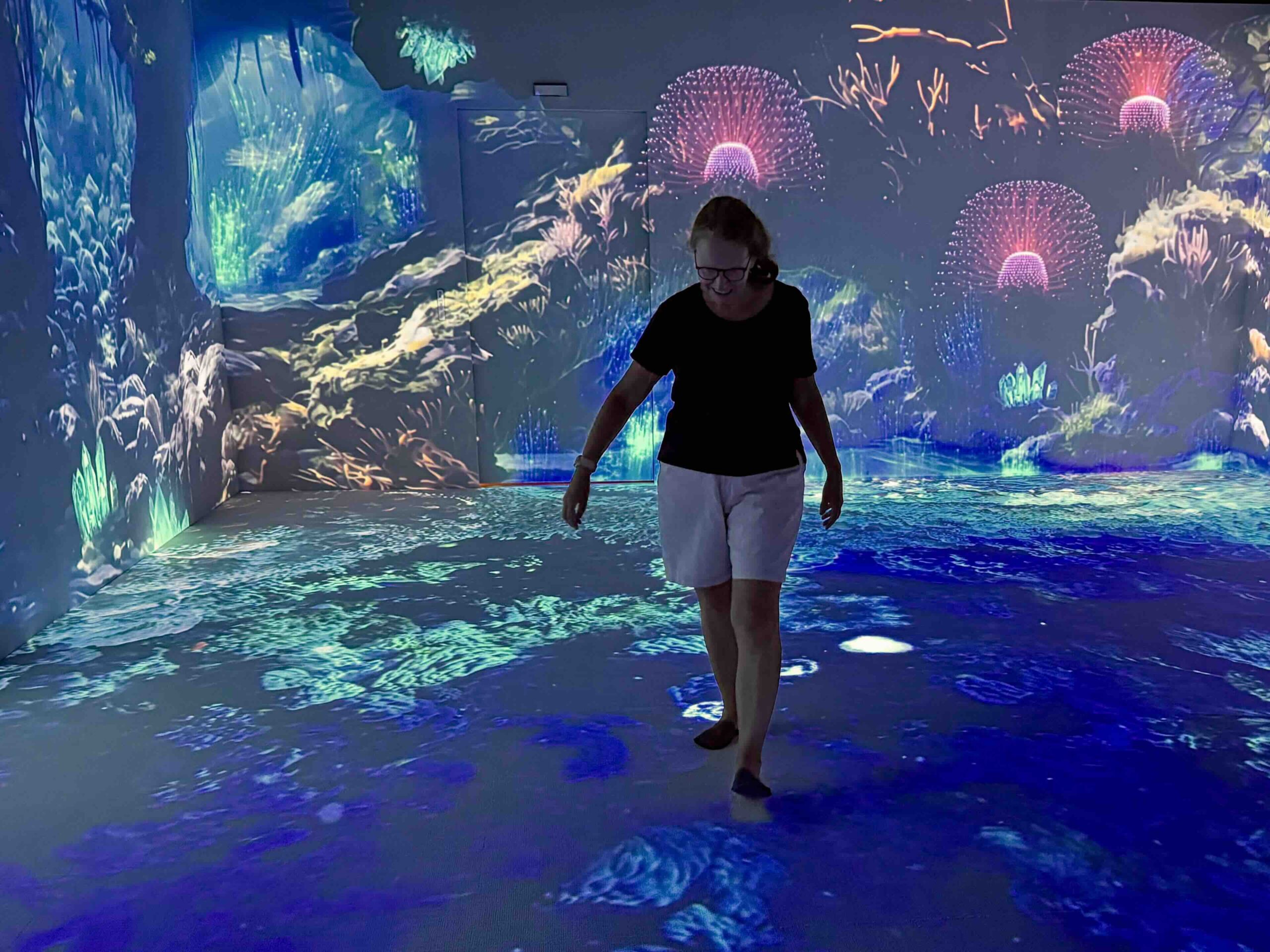 Unvergesslich wird mir Anping aber nicht wegen der kolonialen Bauten bleiben, die recht schön anzusehen sind – es ist das, was das Hotel allabendlich in seinem „Medienlabor“ bietet. Die Projektion unterschiedlichster Szenen auf Wände und Boden, die man entweder gemütlich auf Sitzsäcken flezend oder durch den Raum spazierend genießen kann, ist ein echter Traum. Bewegt man sich, hinterlässt man Lichttapser auf dem Boden und an den Wänden. Am letzten Abend staunen wir mit einem kleinen Jungen um die Wette, der dann seine Zuneigung dadurch zum Ausdruck bringt, dass er Eric Großvater nennt. Kurz sind wir irritiert, aber klar, das könnte unser Enkel sein.