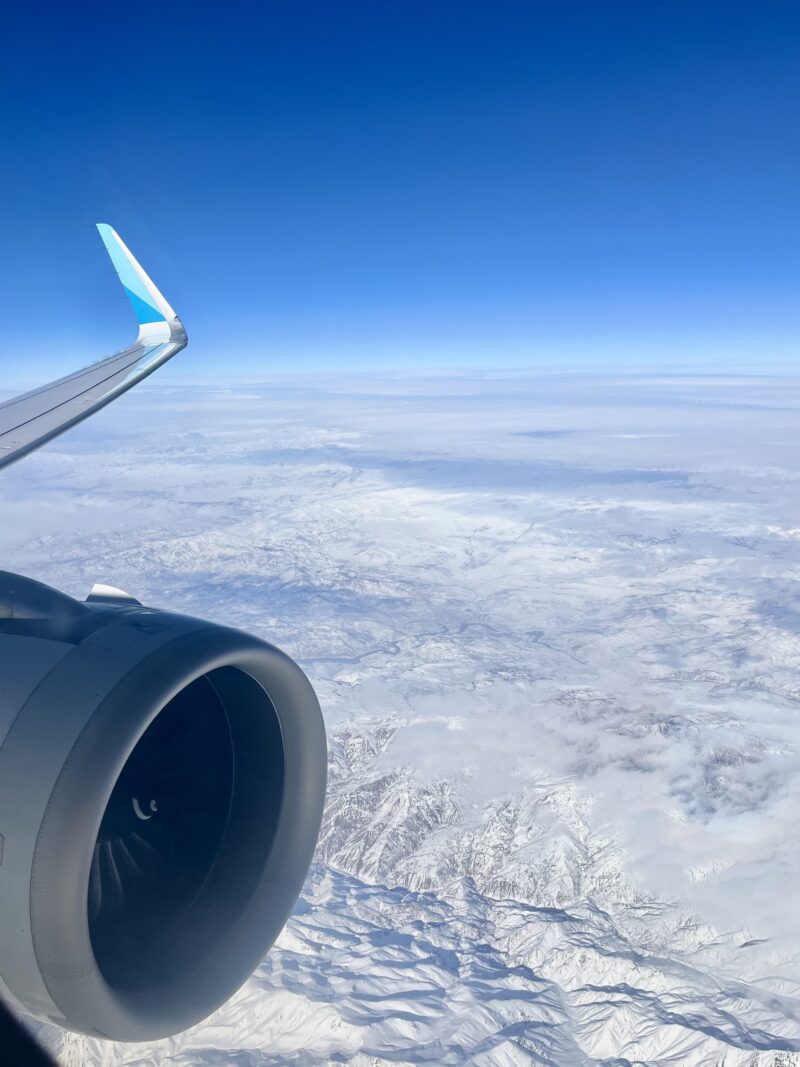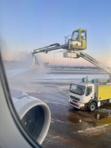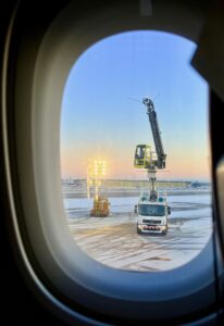 Vor dem Start rollt die Maschine noch zur Enteisung – ganz faszinierend, bis der Sprühstrahl unser Kabinenfenster trifft und rostrote Streifen auf der Scheibe hinterlässt als würde uns ein Schaummonster einspinnen. Fangen so nicht Horrorfilme an?