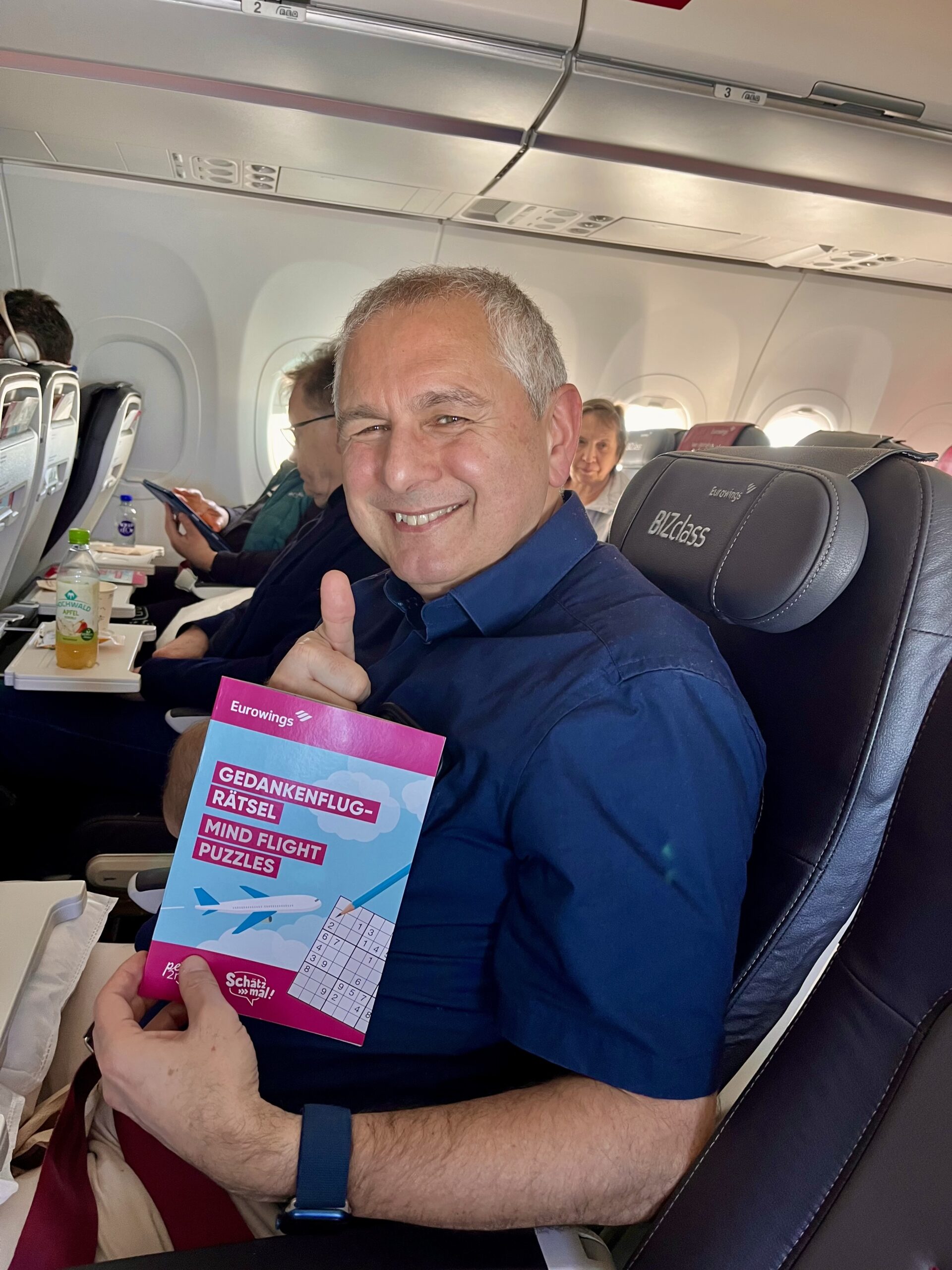 Die S-Bahn lässt uns auch heute nicht im Stich – bereits eine Stunde nach Betriebsbeginn hat sie ihre Standardverspätung von zehn Minuten erreicht. Aber egal, wir haben gut geplant und sind zudem quasi Business-Class Passagiere mit Priority wo es nur geht. Allerdings bei Eurowings – BizClass heißt das erstaunlich günstige Angebot mit angenehmer Beinfreiheit, Essen und Trinken satt, während in den Reihen hinter uns die Kreditkartenmaschine rattert, und einem riesigen Entertainment-Programm – bestehend aus einem Rätselheft. Doch der Rotwein aus der Plastikflasche, serviert im Kaffeepappbecher, trägt später dann durchaus zur Hebung meiner Laune bei.