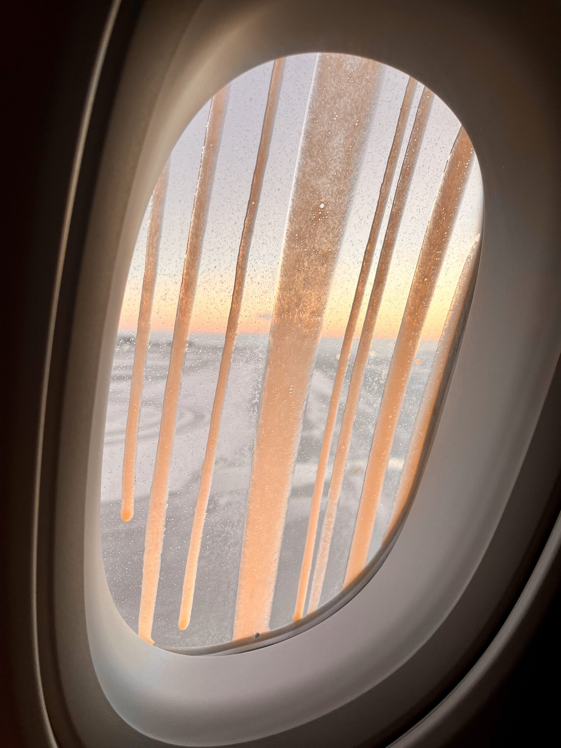 Vor dem Start rollt die Maschine noch zur Enteisung – ganz faszinierend, bis der Sprühstrahl unser Kabinenfenster trifft und rostrote Streifen auf der Scheibe hinterlässt als würde uns ein Schaummonster einspinnen. Fangen so nicht Horrorfilme an?
