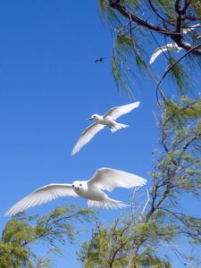 Untertreibung. Wir fahren über eine Stunde durch die seichte Lagune und müssen dann noch mal ein ziemliches Stück durch das flache Wasser waten. Schon dabei wird klar – die Insel gehört den Seeschwalben und die sind vollkommen furchtlos. Die Begegnung mit den Vögeln ist für mich so einmalig und wunderbar, dass ich darüber sogar das Baden vergesse. Nur ein, zwei Meter über oder neben mir fliegen sie, schneeweiße Feenseeschwalben mit schwarzen Augen und Schnäbeln. Elegant-graue Noddiseeschwalben zeigen ihre Flugkünste und das alles vor türkisfarbenem Wasser und dem strahlenden Blau des Himmels. Ich bin wie verzaubert, ein wirklich einmaliges Erlebnis.